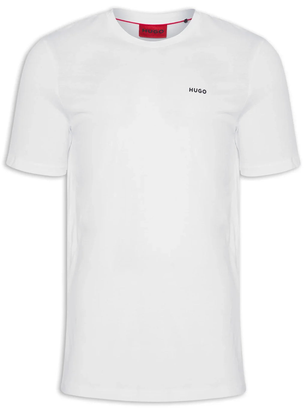 Preto, algodão misto, tecido com stretch, estampa frontal de logo, gola redonda, mangas curtas e barra reta.